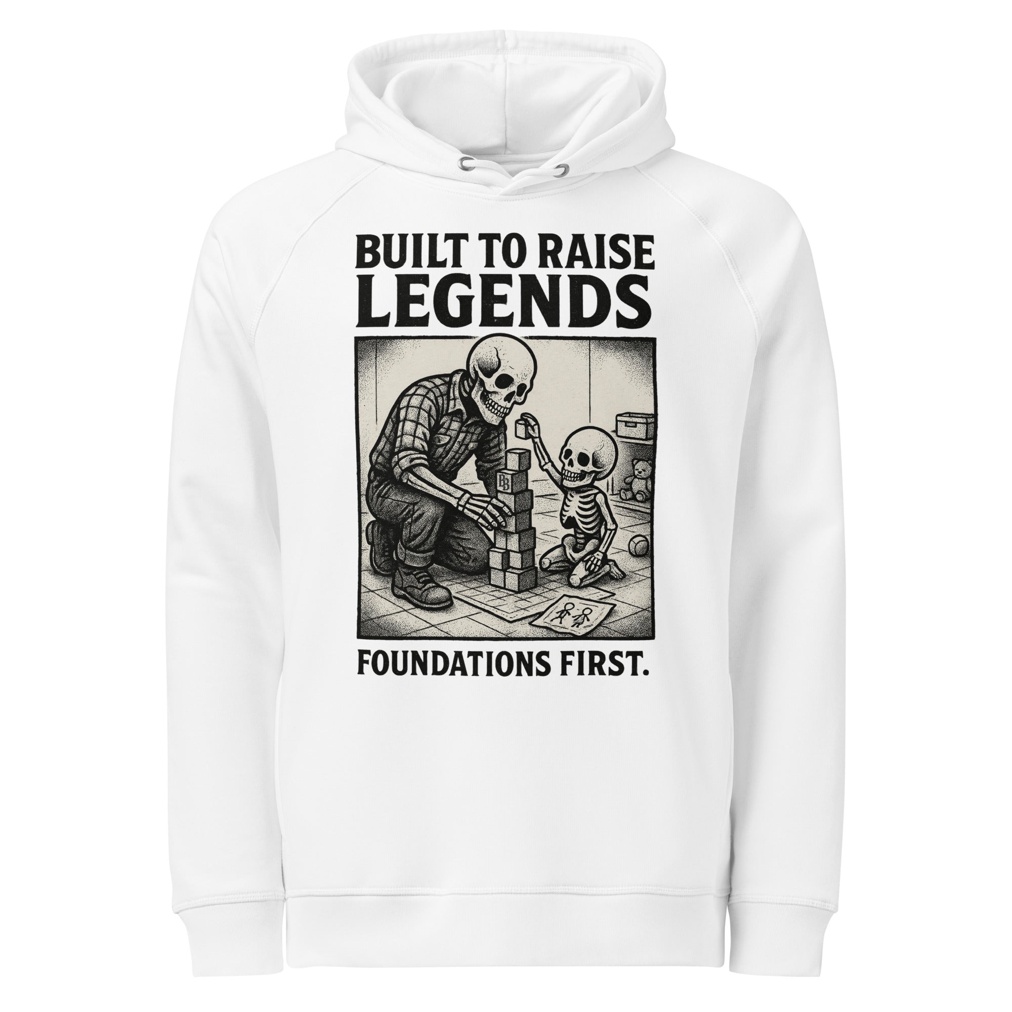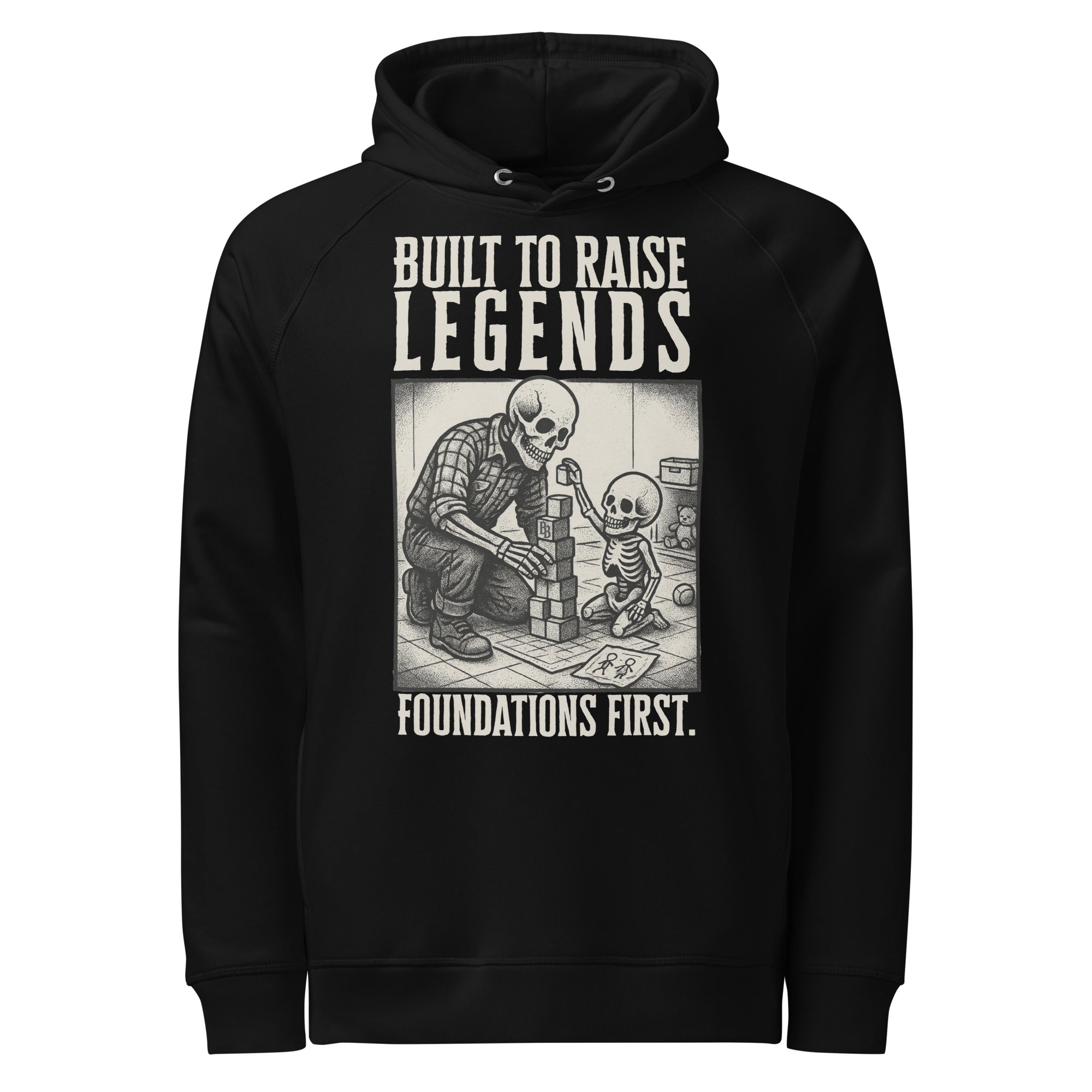 This design shows a skeleton dad and child locked in, stacking blocks not just for fun - but for future greatness. The toys are scattered, the flannel's rolled