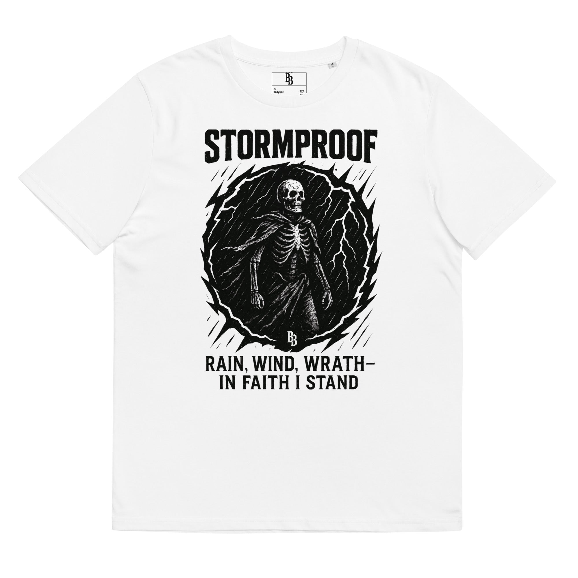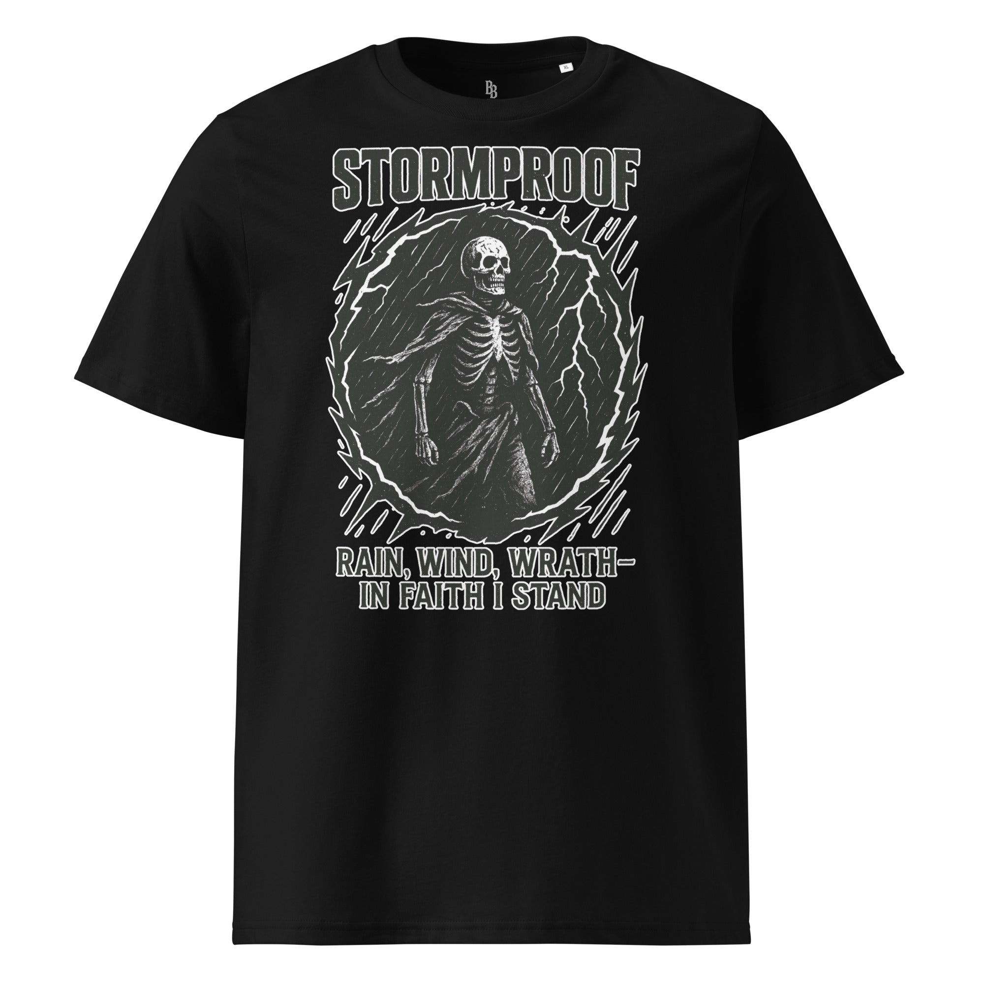 This design doesn’t flinch — a cloaked skeleton pushes forward through lightning and chaos, calm in the eye of the storm. His power doesn’t come from armor or muscle — it comes from belief. The kind that holds when the skies break, the ground shakes, and everything says “run.”