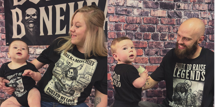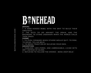 BUFFALO BONEHEAD STARTED IN OUR LIVING ROOM - BUILT FROM LATE NIGHTS, BOLD DREAMS, AND A WHOLE LOT OF GRIT. MY HUSBAND DILLON AND I WANTED TO CREATE MORE THAN SHIRTS. WE WANTED A BRAND THAT MEANT SOMETHING. SOMETHING FOR THE ONES WHO REFUSE TO QUIT. FOR THE MOMS AND DADS RAISING THE NEXT GENERATION WITH BACKBONE. FOR THE ONES CHASING THEIR OWN DAMN PATH - NO MATTER WHO SAYS THEY CAN'T.